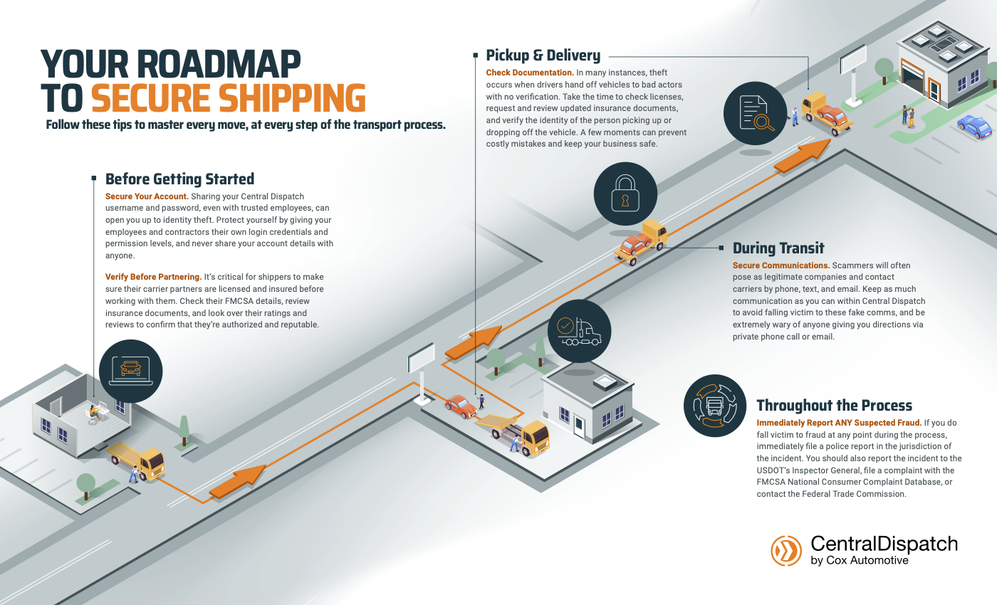 With new platform enhancements, tools, and a dedicated Marketplace Integrity Team, Central Dispatch has everything you need to protect your business and stay in control. Explore this page for tips and best practices that can help you stay ahead and make every move with confidence.