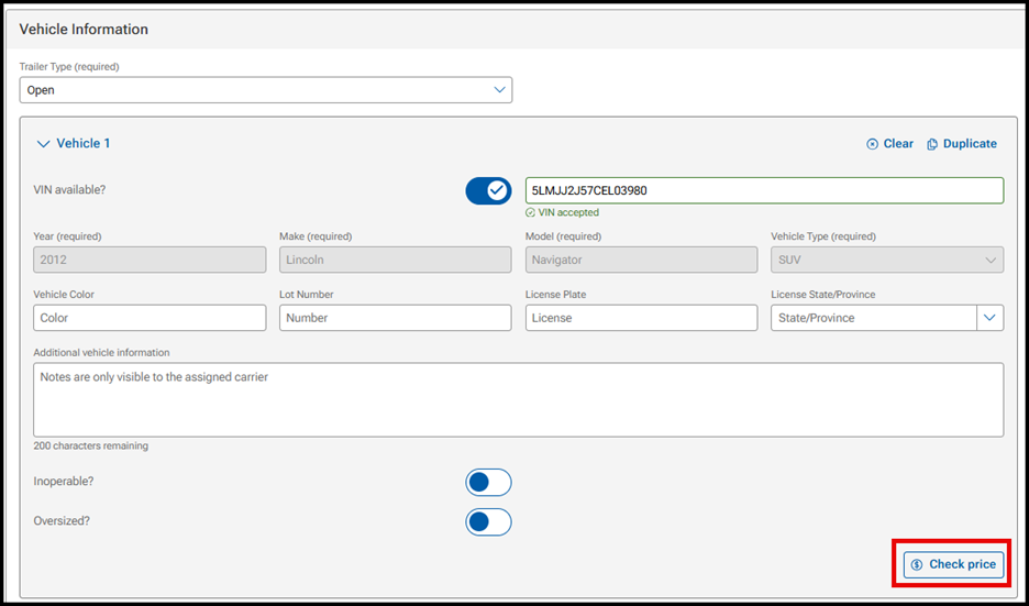 For Shippers on the Create Listing page, click on Check price under the Vehicle Information section