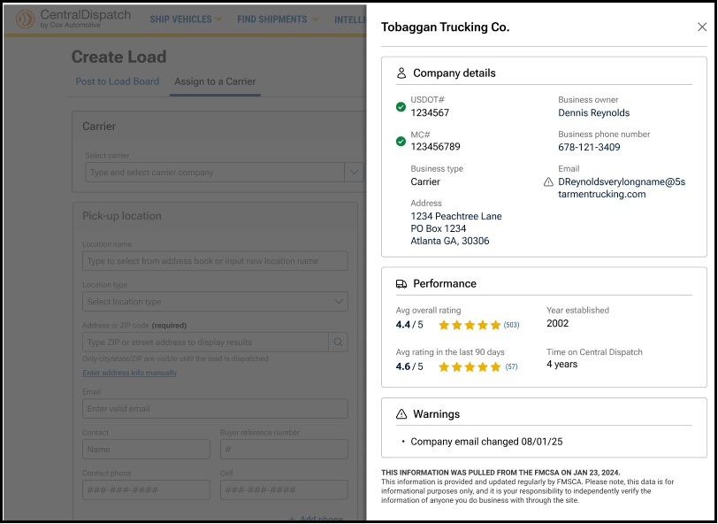 - Slide bar will appear with a carrier scorecard, including performance data, FMCSA data, and a summary of any warnings associated with the carrier to allow for additional investigation. A warning could indicate a recent change in phone number or email address, and are indicated with the triangle icon