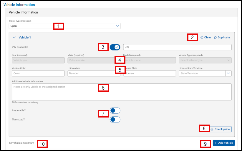 - Note: User can add up to 12 vehicles to a listing, dictated by the maximum carrier trailer capacity