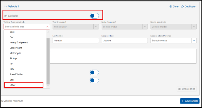 - Under the Vehicle Type field, use the drop-down to select Other