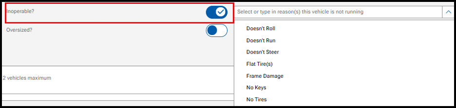 - Inoperable/Oversized: Toggles available to indicate operability of vehicle and if oversized