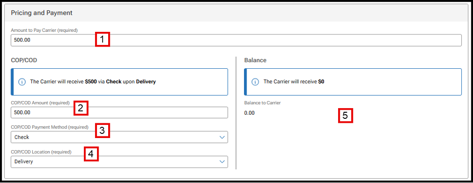 Balance fields: If the total amount owed to the carrier is split between pick-up and delivery, the Balance fields will be populated and required