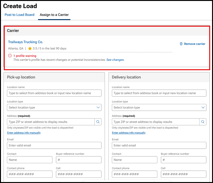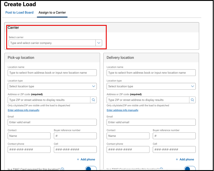 - Users can toggle between the Post to Load Board and Assign to a Carrier tabs without losing any load information that was entered