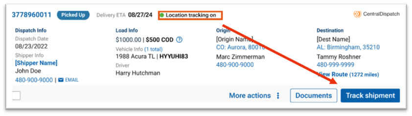 3. If the carrier completed a pickup inspection tracking will be enabled, the dispatch card will have a bullet indicating Locations tracking on and Track Shipment button will be available to view real-time location at any time